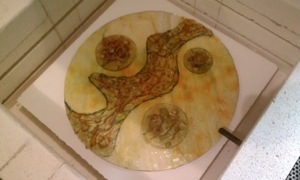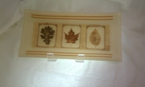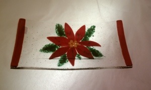 The dish shown is a new design for Christmas. The festive red and green stripes are highlighted by white stringer spacers and is slumped into a 5″ X 10″ rectangular shape.