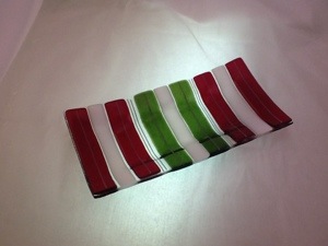 This 5X5 inch Sushi dish is designed for the 2012 Christmas Season. It is a deep red ornament with a textured white stipe through the middle. Fired as a contour fuse and slumped into a shallow sushi dish design. See this dish and other new pieces at The Garden Gallery in Elkhorn.