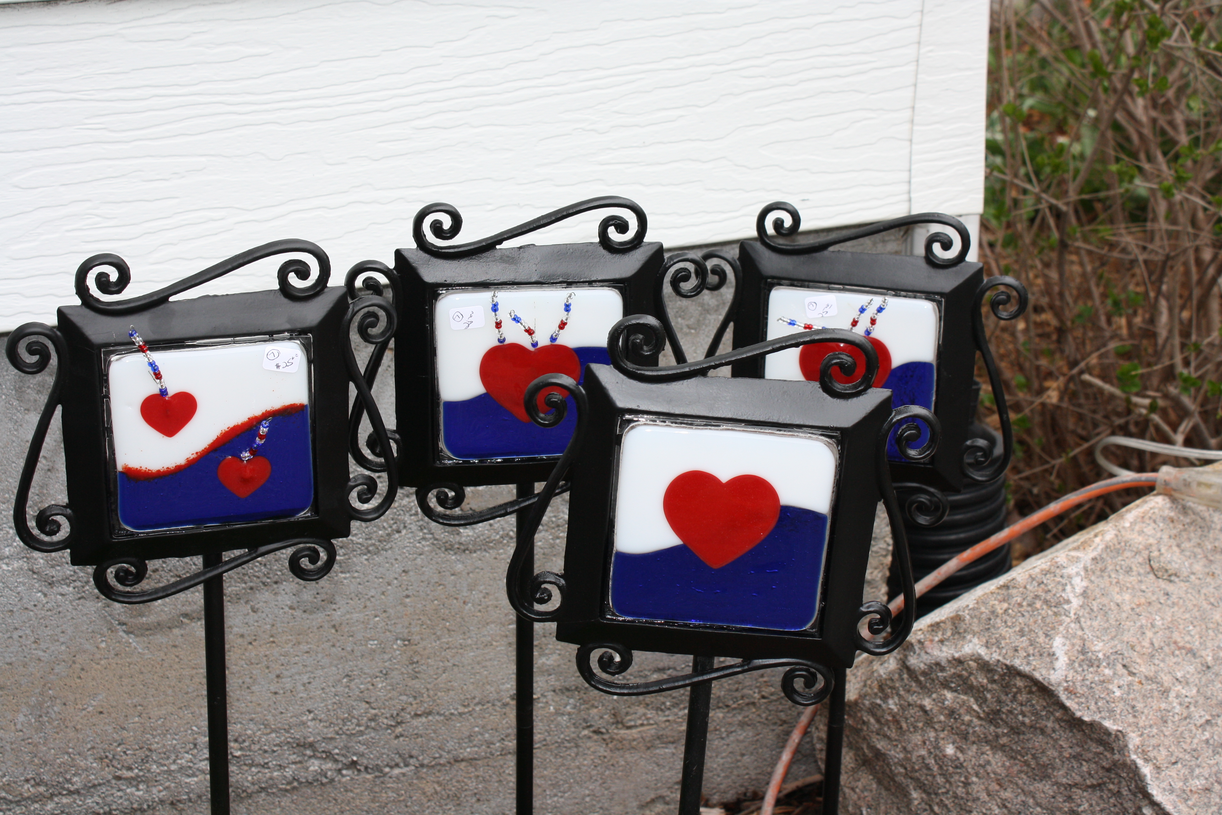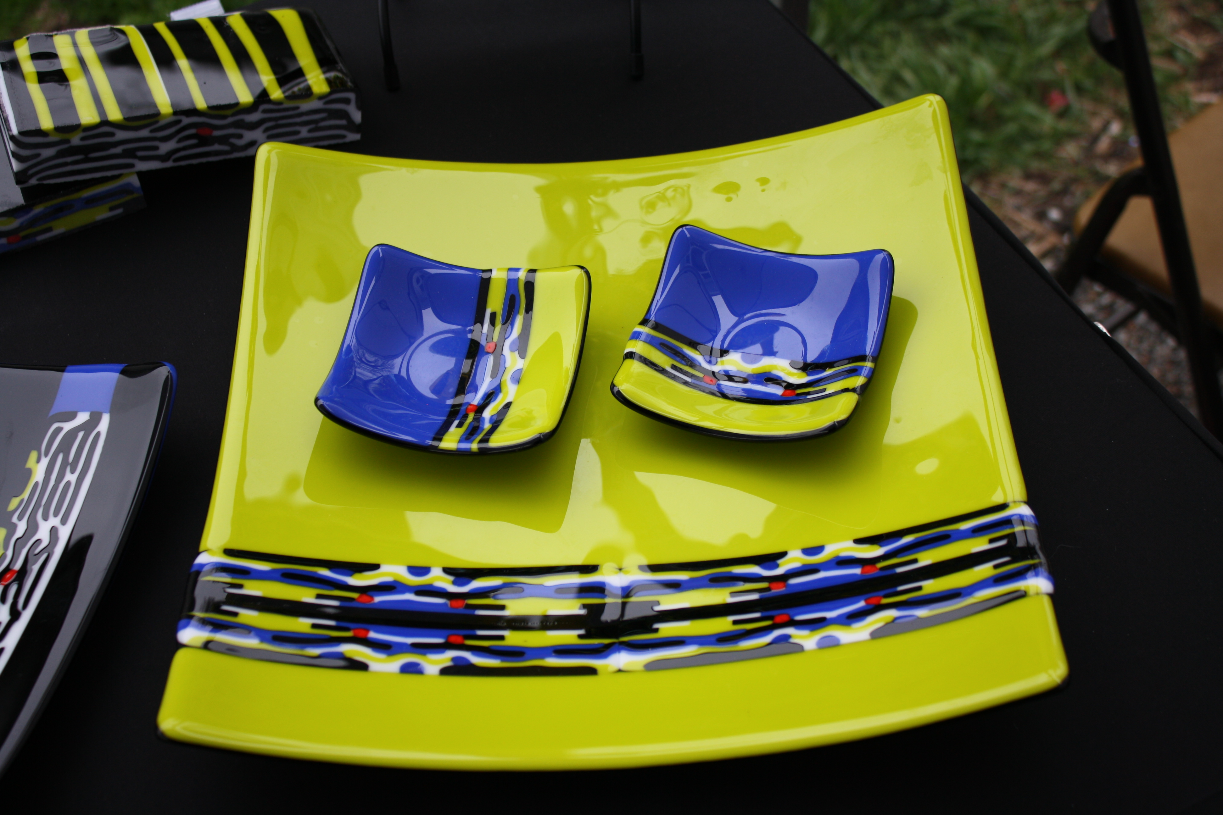 Check out my newest discovery in Glass Art Design. Pattern Bars are made by stacking layers and layers of glass and then firing them into one big block of glass. When you slice the glass on the edges – no easy task I might add – these great random designs emerge. When they are incorporated into the glass and then fired – magic happens. This is a 12 inch square sushi plate of “Sea Grass Green.” The pattern bars are a mixture of black, white, blue and red pieces of glass. I’ve sliced the pieces and place four of the slices in the bigger glass. A new pattern emerges when you switch up the pieces or you rotate them around. No two pieces are the same. This 12X12 inch piece also includes two 4 inch sushi dishes for dips and sauces. More will be available soon at The Garden Gallery.