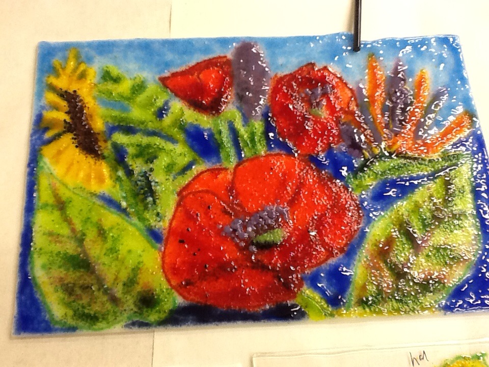 Good intentions have not produced results! I can’t believe it has been over a year sine I made an an entry on this site. And, I thought retirement would give me more time to dedicate to glass. Well the glass has been getting a lot of attention – I just haven’t posted. So, I am committing to making at least two entires a week just to get me started. Here is a piece I made during an Ann Nye Class in Sept 2013. This is a study on botanicals. Several techniques were taught and I wanted to use each technique in the final project. What started as a smattering of different flowers, leaves and techniques turned out kind of cool as a grouping. Ann posted it on her site and I was thrilled!