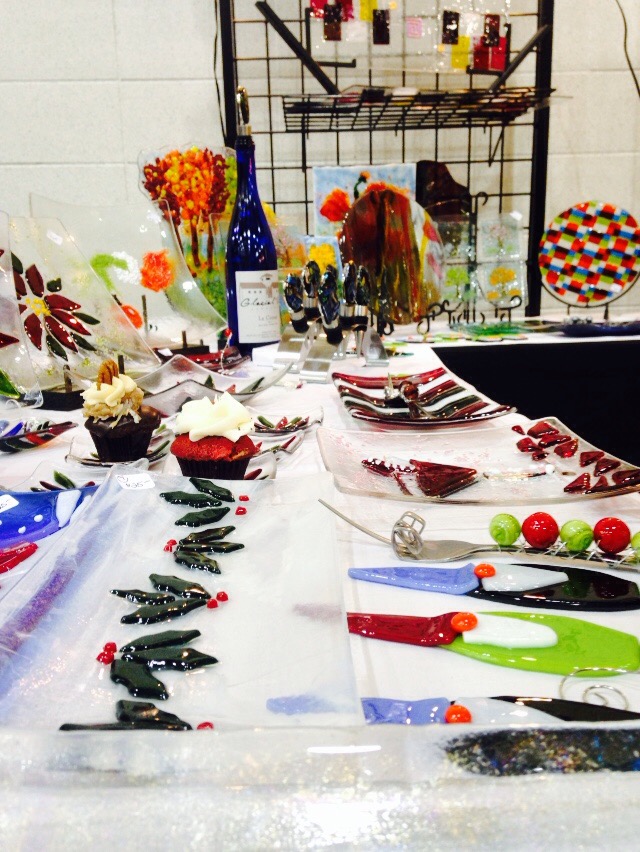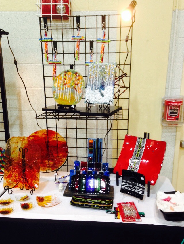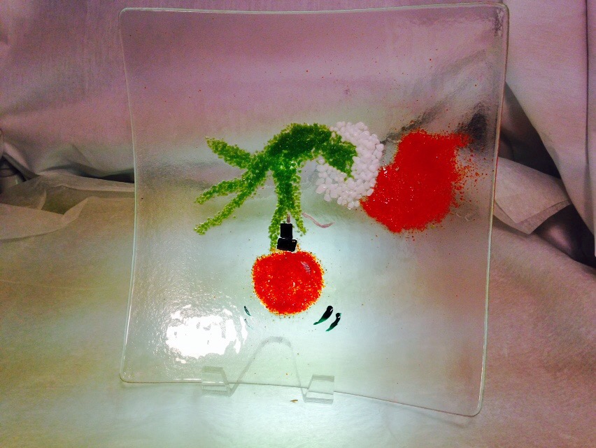 Just finished some great pattern bar plates. The black and white sections of the plate are actually slices of a stack of black and white ( with a little red and yellow) pieces of glass fused together. When laid on their sides and sliced, they make interesting patterns. I hadn’t tried the red for a base but I love the results on this 12″ x 12″ plate. The black plate (5″ x 5″) with the pattern bar lends a zebra style to the project.